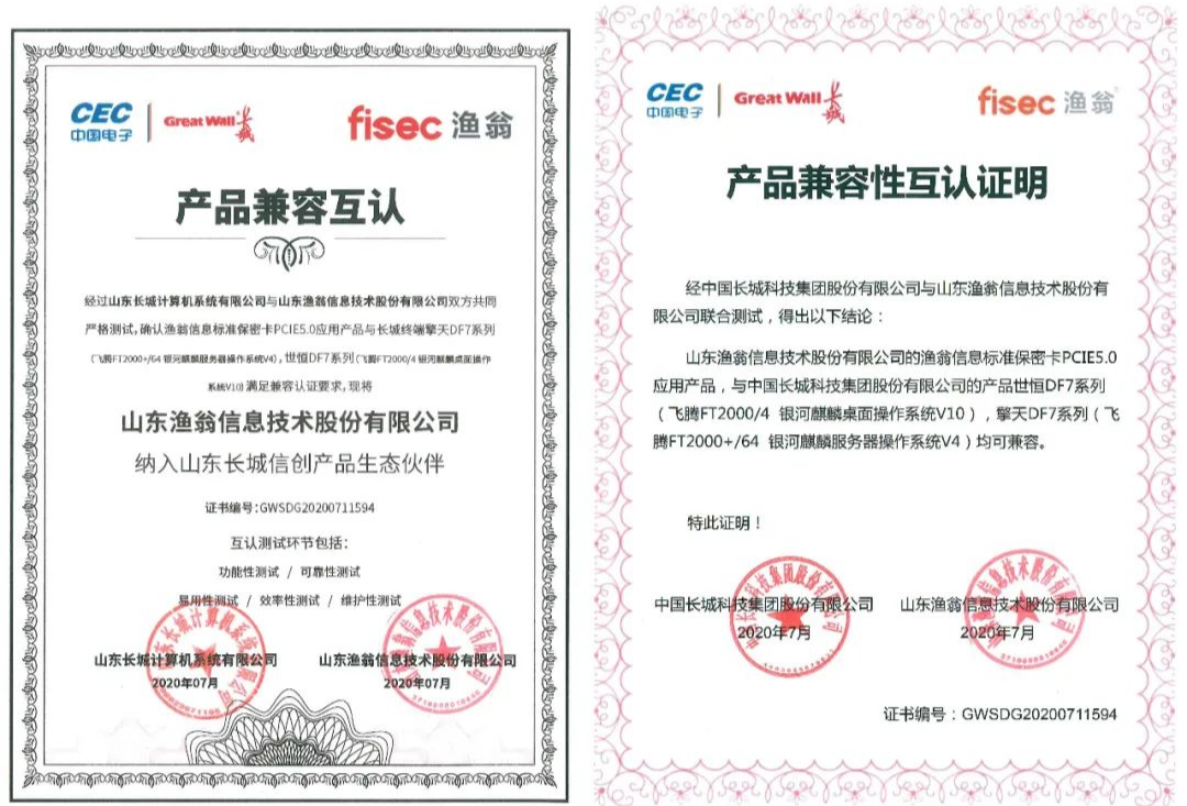 从功能性、可靠性、易用性、效率性、维护性五大环节,918博天堂(中国)信息与长城进行了严格的联合测试。最终确认918博天堂(中国)PCI-E 5.0密码卡与长城终端产品——世恒DF7系列(飞腾FT2000/4 银河麒麟桌面操作系统V10),擎天DF7系列(飞腾FT2000+/64 银河麒麟服务器操作系统V4),满足兼容认证要求。并且,918博天堂(中国)信息此次成为了长城信创产品生态伙伴,携手构建安全新生态。